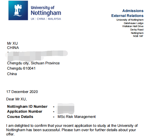 诺丁汉大学的世界排名虽然没有爱丁堡大学高,但是要知道,诺丁汉大学和爱丁堡大学一样,也是设有中国院校名单列表的。徐同学所就读的国内大学,也不在此名单列表内,但其依然凭借有针对性并充分的准备,打破了所谓大学名单的限制,顺利拿到了录取通知书。所以,想办法让自己变得足够优秀,提升自身竞争优势,你仍然是有被名校录取机会的。
