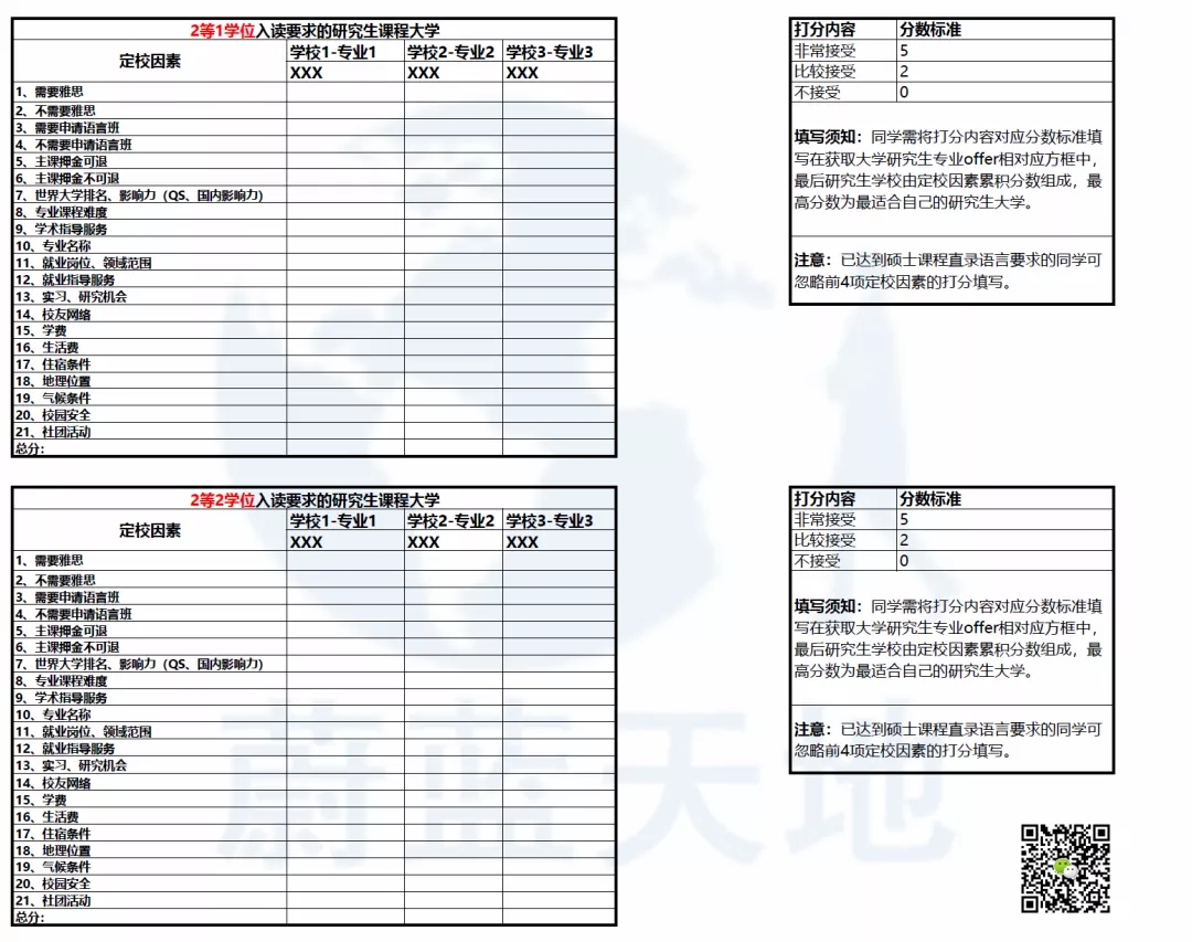 在这里,Shelley姐制作了一份2022年入读英国大学研究生课程定校因素打分表给大家,通过自查打分表格内容,同学一定能科学合理的定位最适合自己的研究生课程大学。同学在定校过程中有疑问,可以联系Shelley姐。