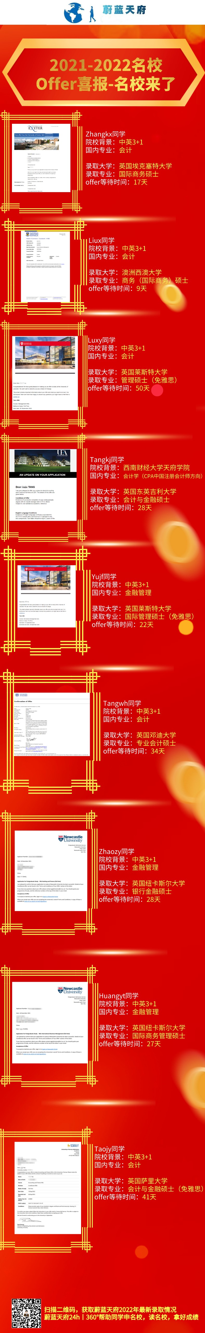 2022年海外大学申请进行时!目前蔚蓝天府老师已为同学拿到了最新的2022年海外名校offer,本周展示的名校offer战绩大学非常多元化,有澳洲昆士兰大学、澳洲莫纳什大学、澳洲西澳大学、英国卡迪夫大学、英国南安普顿大学、英国谢菲尔德大学、英国埃克塞特大学、英国雷丁大学、英国约克大学、英国贝尔法斯特女王大学、英国拉夫堡大学、英国莱斯特大学、英国邓迪大学、英国萨里大学、英国东英吉利大学。期待后面还有更多海外大学offer光顾我们的同学,11月剩下的日子里,请海外大学对我们同学好点哦!下面我们就来看看2022名校offer喜报的部分具体录取动态吧!
