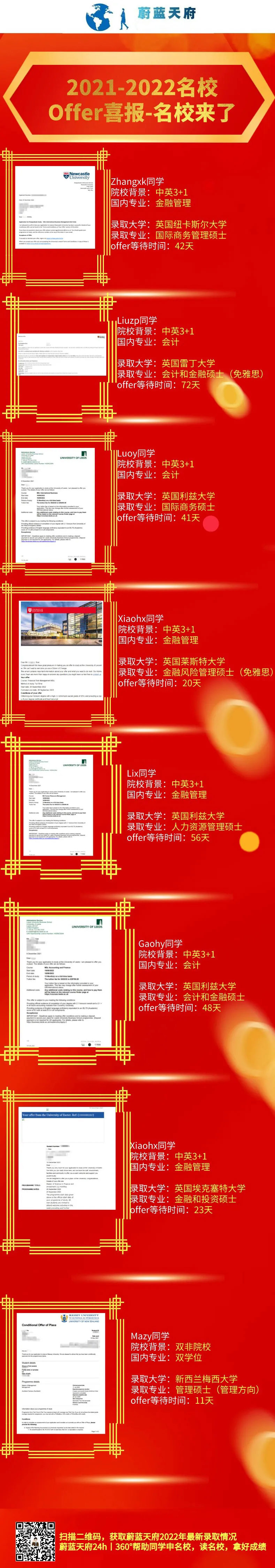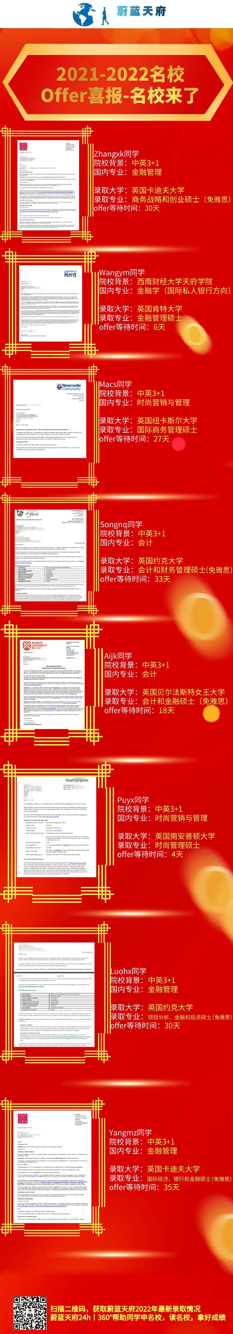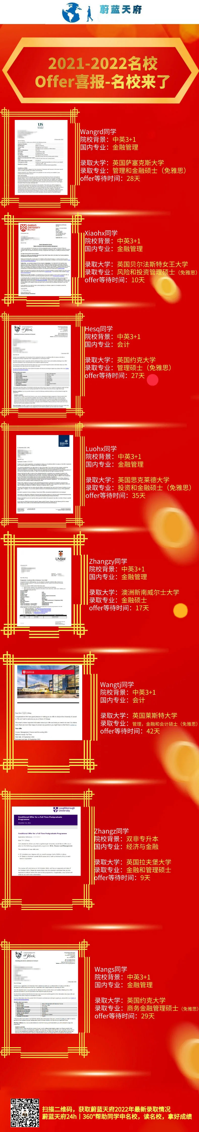 2022年海外大学申请进行时!目前蔚蓝天府老师已为同学拿到了最新的2022年海外名校offer,本周展示的名校offer战绩大学非常多元化,有澳洲新南威尔士大学、澳洲昆士兰大学、英国利兹大学、英国南安普顿大学、英国卡迪夫大学、英国埃克塞特大学、英国雷丁大学、英国约克大学、英国贝尔法斯特女王大学、英国莱斯特大学、英国思克莱德大学、英国萨塞克斯大学、英国萨里大学、新西兰梅西大学等。期待后面还有更多海外大学offer光顾我们的同学,12月快结束了,请海外大学对我们同学好点哦!下面我们就来看看2022名校offer喜报的部分具体录取动态吧!