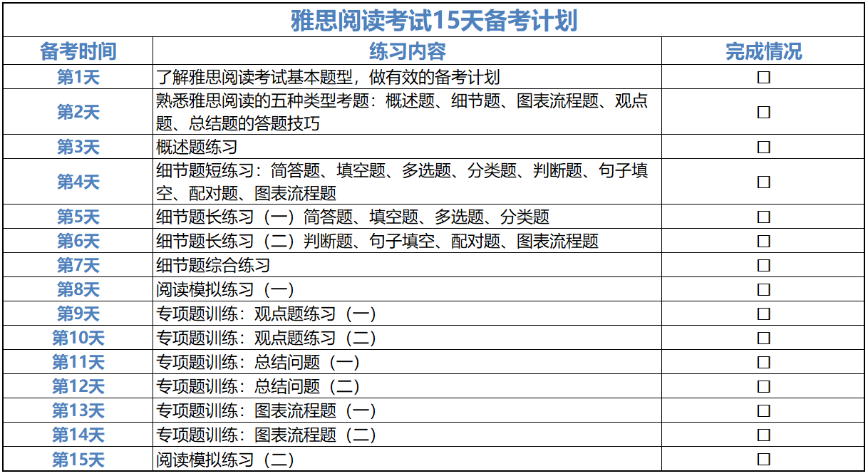 很多同学备考雅思考试时,无从下手,尤其是在准备时间较短的情况下。那么这个文章系列你可不能错过!蔚蓝天府老师将为大家开设一个雅思备考系列,为大家讲解如何在15天内备战雅思考试,根据雅思听力,阅读,口语,写作为大家讲解详细的备战计划。今天要讲解的系列就是如何在15内备战雅思阅读计划,首先我们需要制作一张备战雅思阅读考试的15天备考图,这里面要详细标明在这15天内每天我们要做些什么,然后根据流程备考图拿下雅思阅读高分。