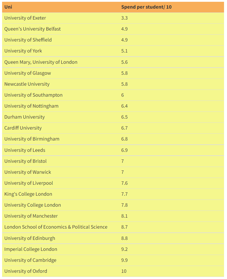事实证明,英国罗素集团大学中的埃克塞特、谢菲尔德和贝尔法斯特女王大学在学生身上的花费最少,较为吝啬。与此同时,牛津大学和剑桥大学将任何在他们的大学里占有一席之地的人都视为纯粹的皇室成员,花费大气。