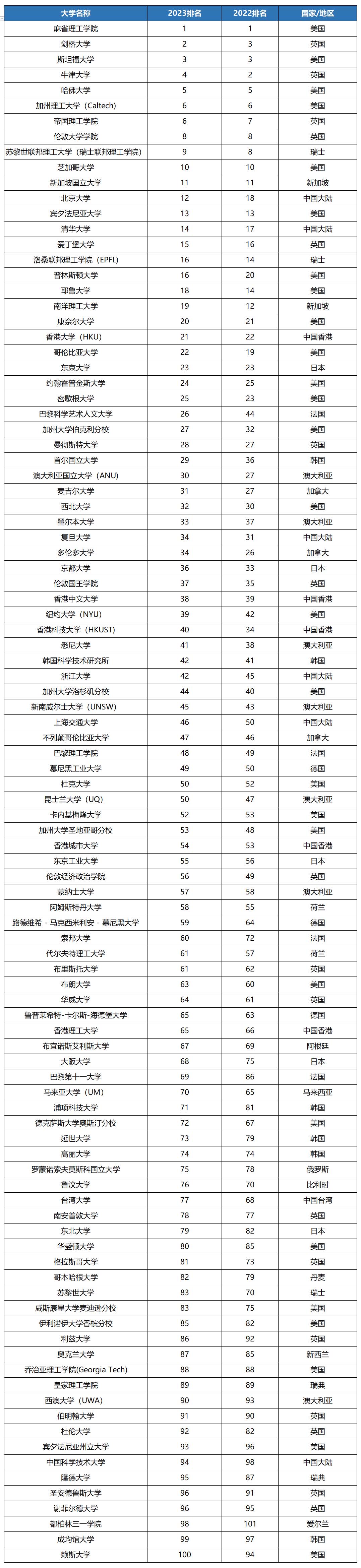1、MIT连续11年霸榜世界第一,剑桥大学时隔8年再次夺回TOP2的位置,超过英国牛津大学(排名第3);帝国理工学院则较去年上升了一名,位列第6。