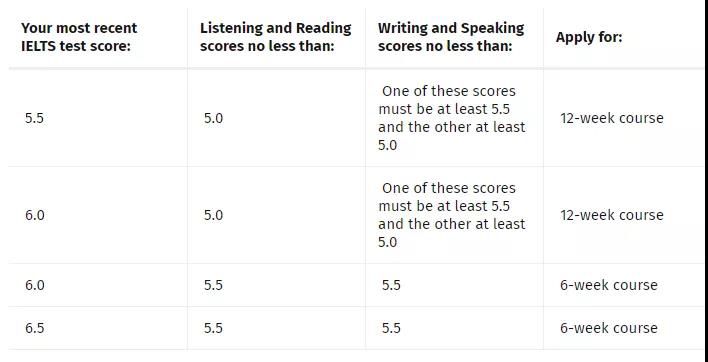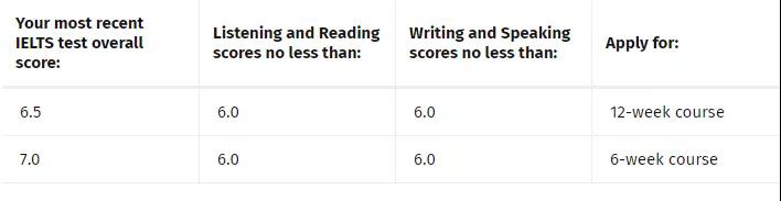 5周:【BandA/B+】雅思7(单项6.5);【BandB】雅思7(单项6);【BandC/D/E】雅思6.5(单项6);雅思6(单项6)