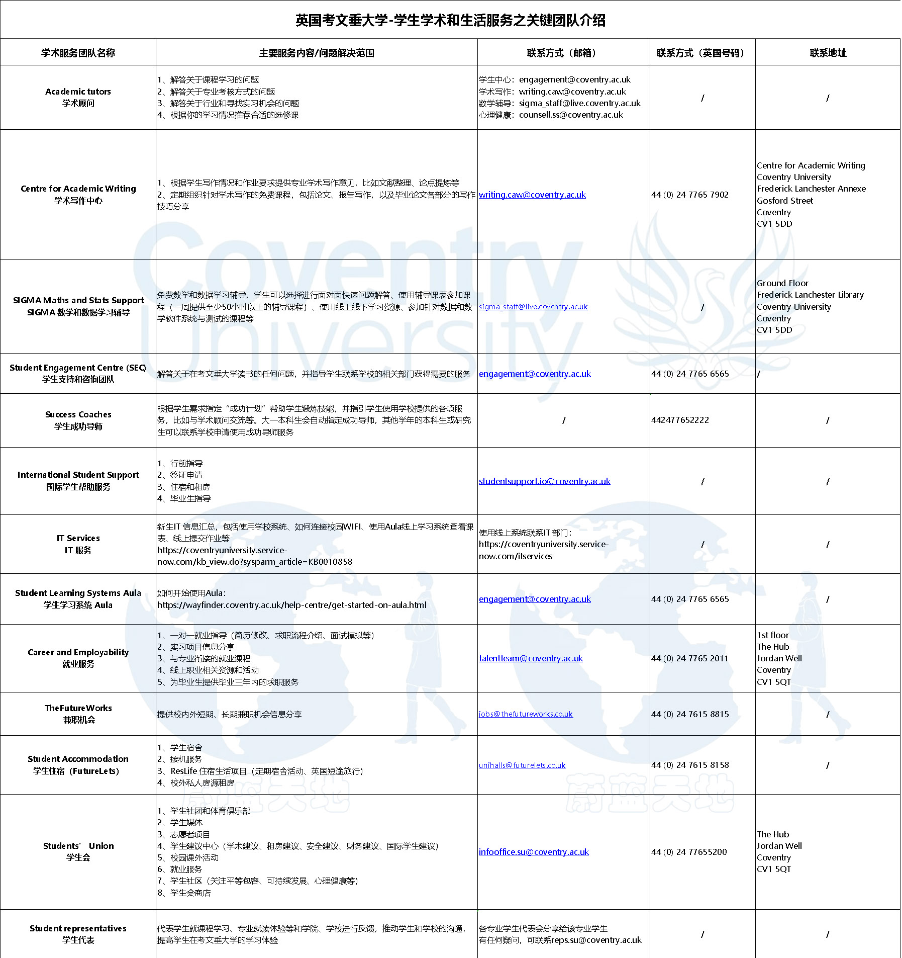 我们与英国考文垂大学中国办公室老师合作,真心诚意地为考大准留学生们制作了有用的当地办公室工作内容和联系方式,秉承24小时和360度学生服务理念,打破国境内外的交流屏障,为中国留学生带来舒适和满意的留学服务体验。