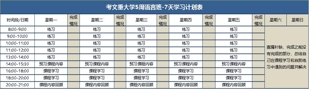 ③最后,Sofia老师为参加考文垂大学5周语言班的同学,制定了7天语言班学习计划表,以便于同学合理安排语言班课程学习时间。