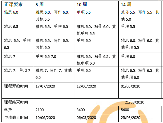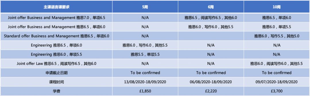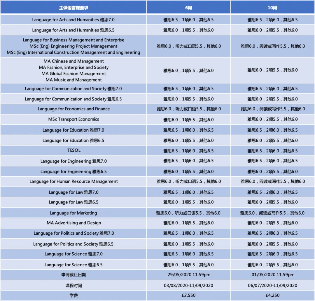 英国大部分院校的语言班情况: