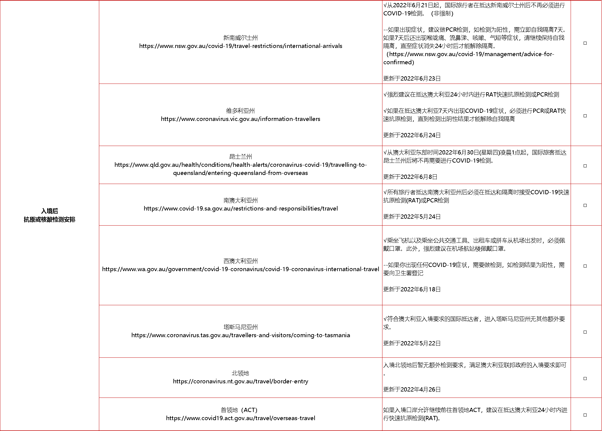 4、目前入境澳大利亚维多利亚州、首领地(ACT)的旅客需要在24小时内进行RAT快速抗原检测或PCR检测,南澳大利亚州入境也需要进行RAT快速抗原检测或PCR检测。