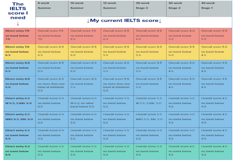 6周:雅思6(单项不低于5.5)或者雅思6.5(两个单项(含阅读)6,其他5.5)