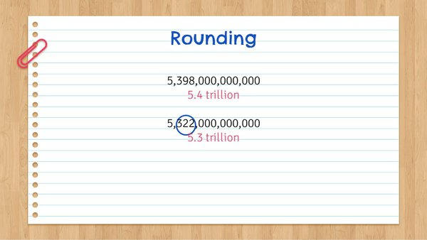 当数字变得非常大时,同学们不用说出或写下每个数字。可以通过向上或向下舍入到最接近的大数字来缩短它。比如图上的两个大数字就可以缩写为“five point four trillion”,“five point three trillion”。(trillion:万亿)