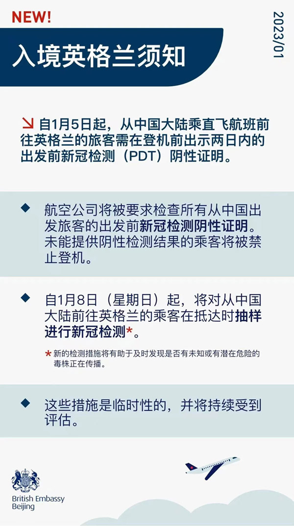 据英国移民局消息,自2023年1月5日起,从中国大陆前往英格兰将需提供两日内新冠检测结果。11岁及以下儿童无需提供。此规定适用于所有从中国大陆出发的直飞和转机航班。转机航班包括在到达英格兰前一次或多次经停其他国家和地区的航班,包括经停香港和澳门。此规定不但适用于英格兰作为最终目的地,英格兰作为经停地也同样适用。