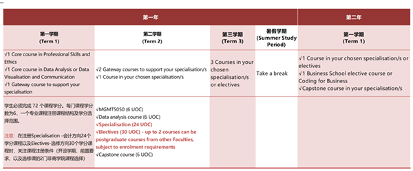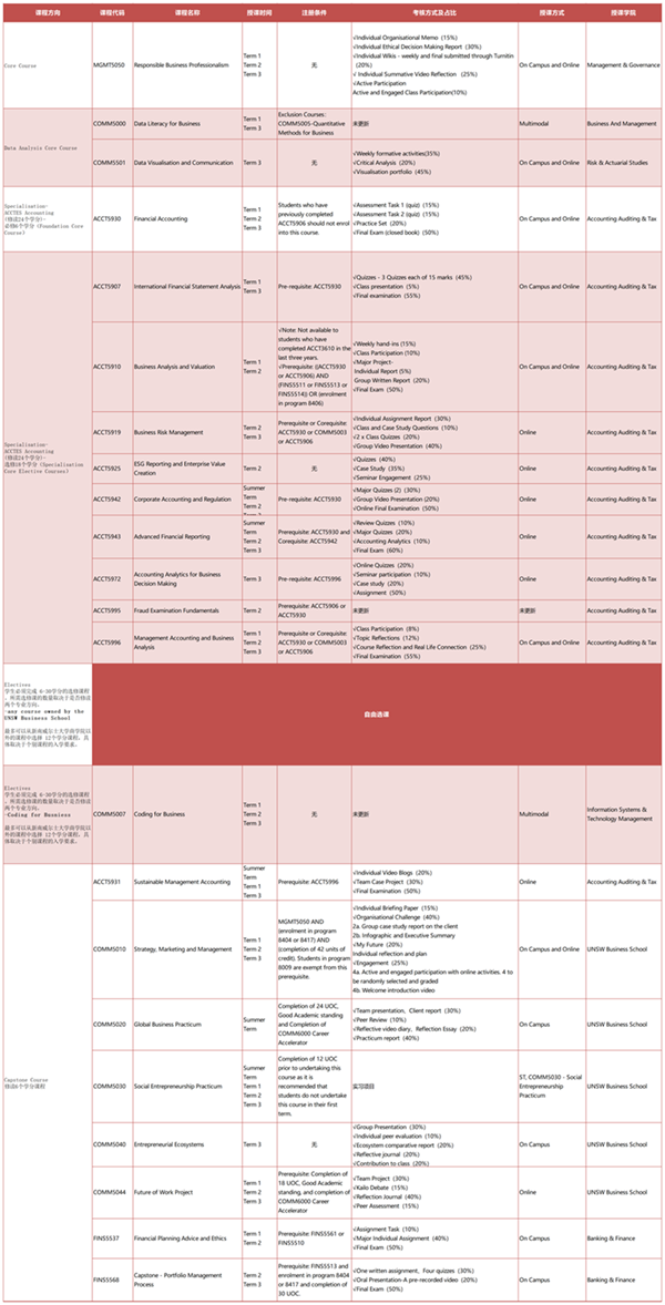 举例,新南威尔士大学Master of Commerce(Accounting)专业,一学期修读3门课程,教学时间及课程添加方向建议: