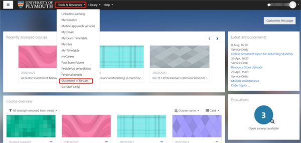 提交或参加课程评估后,你的临时课程成绩结果通常会在评估截止日期后20个工作日内显示。临时(待定)的课程成绩结果将显示在你的结果声明(电子成绩单)【statement of results (e-transcript)】中,可登陆学生门户中的tools and resources-statement of results-Additional Details- e-transcript查看。在专业评估小组和学位评估委员会确认之前,它们将保持临时状态。