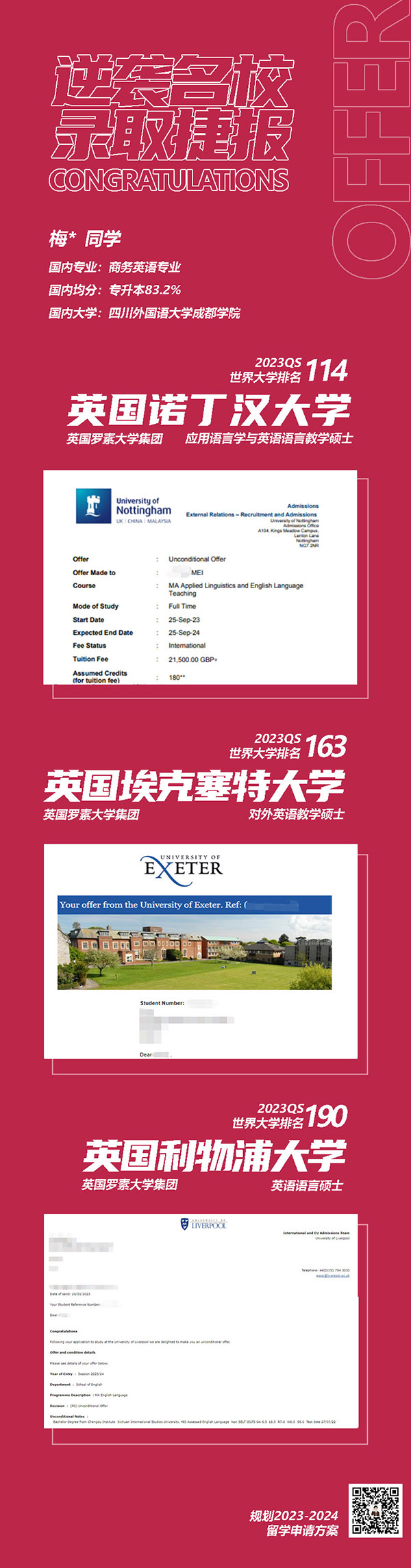 蔚蓝天府老师在正式递交申请前期为同学制作研究生升学诊断规划,就明确了学生的职业发注和专业选择方向,虽然该生专本科所学专业都是商务英语,但是学生的志愿就是成为一名人民教师,职业发展路径非常明确。所以在留学规划和准备过程中,为弥补双非独立院校和专升本背景,就学术背景提升方面做了很多有针对性的积累。从大学助理到实习教师的授课身份转变,从内地教培实习经验扩展到海外授课多元的支教经历(该生曾在四川省内江第六中学、商业教培机构实习,拥有泰国曼谷小学支教经历),甚至毕业论文都写的是《浅析新课标背景下视译法在高中英语教学中的应用》。就所选申请专业,我们为该生申请了教育类下的Teaching和应用语言学相关专业。所选英国大学范围确定为罗素集团大学,目前学生已获得英国诺丁汉大学、英国埃克塞特大学、英国利物浦大学无条件硕士录取通知书,中国香港地区大学申请结果还在等待中。