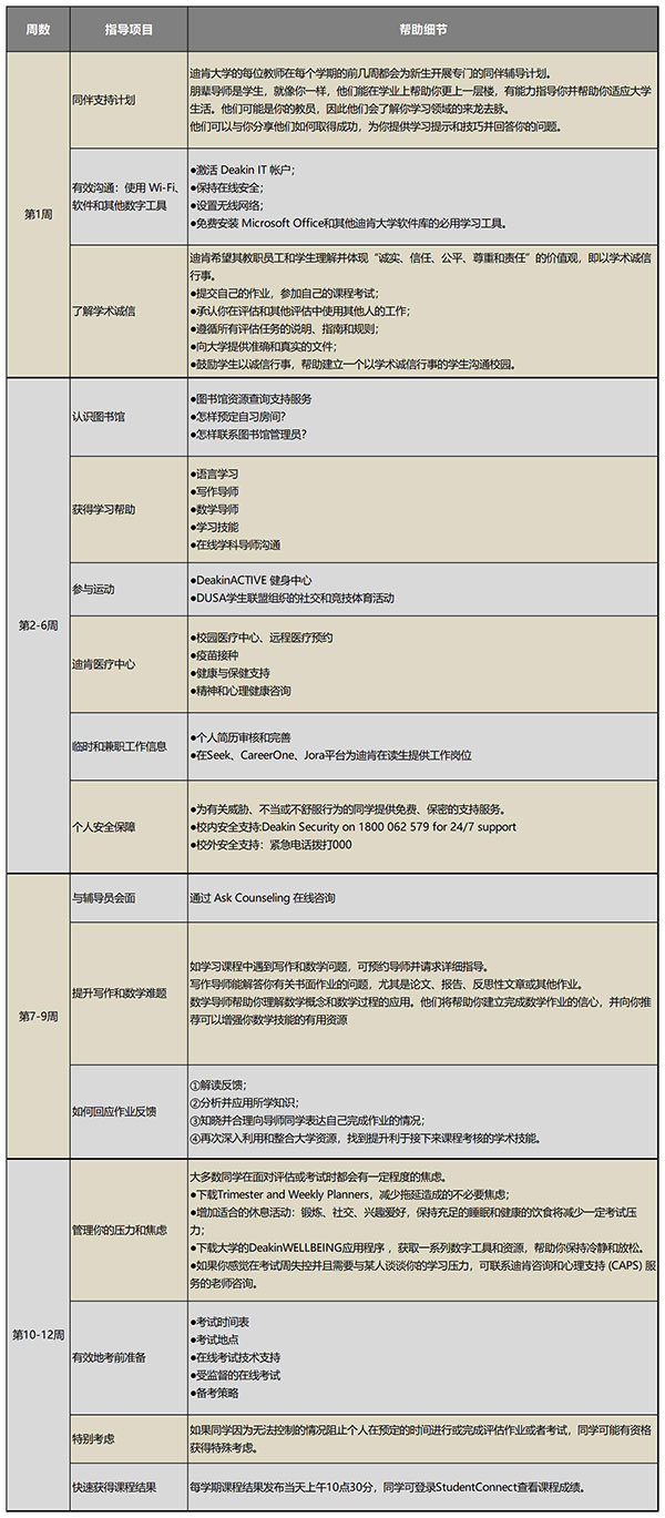 当赴澳留学新生成功地完成了新生注册内容,安顿好了大学住宿,就要准备开始新学期的课程学习。在迪肯大学新学期12周的学习过程中,同学在校可以充分利用学校哪些资源服务?下面的每周学校支持内容会利于你更快适应大学学习生活,并且有效地指导你顺利通过注册学分课程。