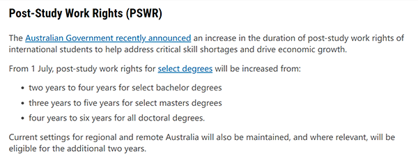 好消息是最近澳大利亚政府宣布延长国际学生毕业后工作权利的期限,以帮助解决关键技能短缺问题,推动经济增长。所以同学们可以获得的485签证时长从之前的2-4年工签时间变成了4到6年。