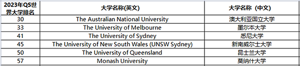 举个例子,特别在意世界大学排名,可以把澳大利亚的院校作为选择之一。澳大利亚院校最大的优势应该就是排名了(如下图),世界排名57位的莫纳什大学,对于海本学生基本上都是可以作为保底的院校了。