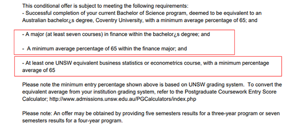 澳大利亚的院校,硕士入学评估还是会考虑国内和国外两阶段学习情况的,所以前期还是需要比较早的有针对性的准备,像均分的提升以及课程匹配方面。比如新南威尔士大学1年制的金融硕士专业,要求本科期间有至少7门金融相关的科目,并且包含至少1门统计学或者计量经济学,如果本身的课程设置上没有完全达到要求,就需要补足。对于未来希望往金融方向发展的同学,本科阶段就一定要注重课程的匹配性。