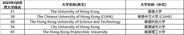 中国香港地区也是近几年我们同学和家长询问比较多的,中国香港地区的院校,前5所的大学,也都是世界排名百强的院校(如下图)