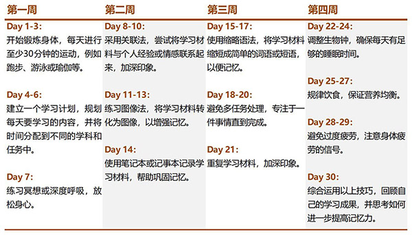 方法知道了,还需要一个30天提升记忆规划表,帮助自己完成加强记忆力的目标: