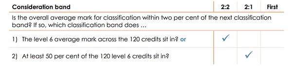 若学生最终成绩仅比更高学位等级分数要求低2%,且学生有50个学分及以上的课程分数位于更高学位等级分数,学校就将授予学生更高学位等级。所以上图示例的同学最终将被授予2等1学位。