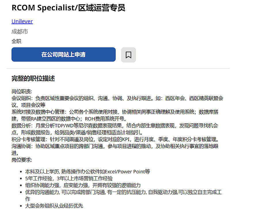 2023年联合利华-区域运营专员(成都)