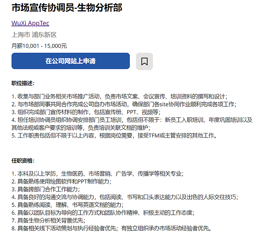 2023年药明康德-市场宣传协调员-生物分析部(上海)