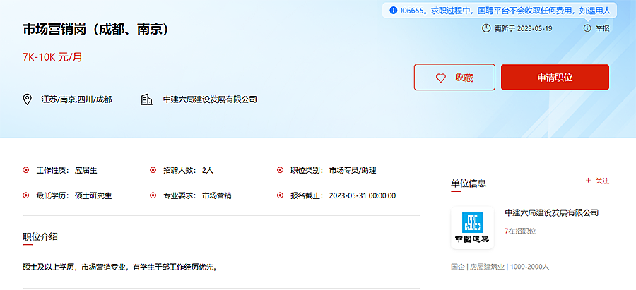 2023年中建六局建设发展有限公司-市场营销岗(成都、南京)