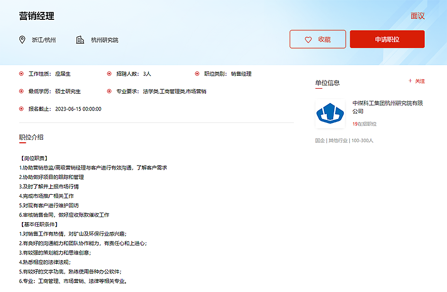2023年中煤科工集团杭州研究院有限公司-营销经理(浙江、杭州)