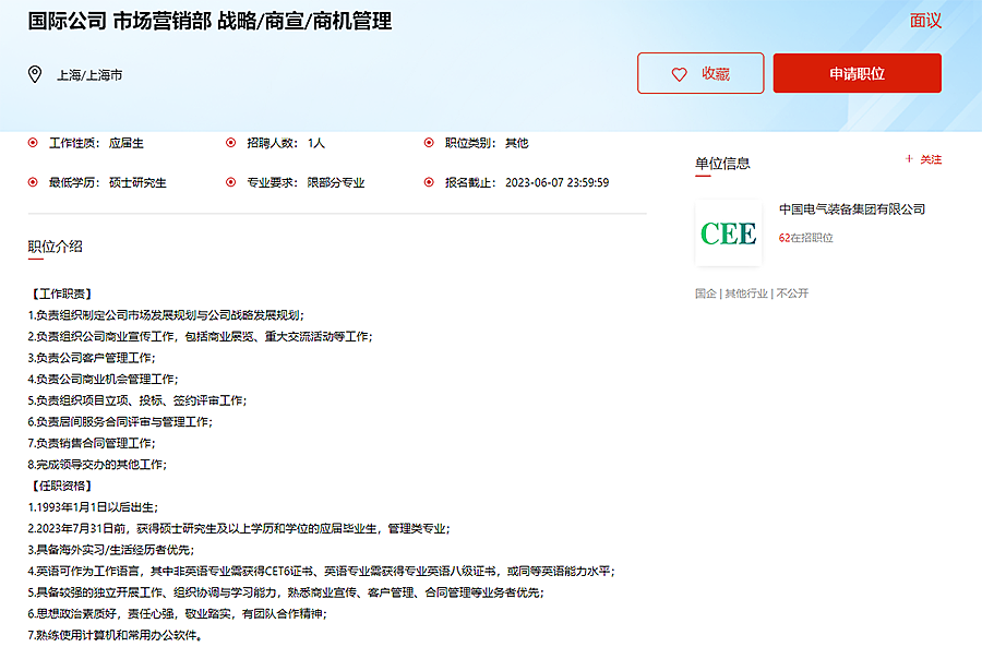 2023年中国电气装备集团有限公司-国际公司市场营销部 战略/商宣/商机管理(上海)