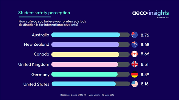 澳大利亚在最安全的留学国家中名列榜首。新西兰、加拿大和英国的得分也很高,总分都超过了 8.5 分。
