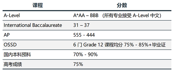 d) 针对国内本科毕业生,学位等级要求与对应国内分数关系,请参考下列表格。