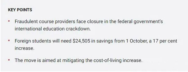 从2023年10月1日开始,国际学生在申请学生签证时,需要证明他们有A$24,505(约115,200人民币)的存款,比之前的要求高出17%。澳洲官方给出的说明是,增加存款金额是为了跟上目前的生活成本,让国际学生在读期间能够负担得起学习生活费用,并且不会因为迫切需要就业而面临被剥削的风险。