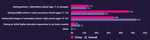 91%的中国学生愿意将英国作为留学目的地,不过他们同时也会考虑多个留学目的地:63%的申请人在申请英国时,也在考虑美国(40%)、加拿大(39%)和澳大利亚(27%)作为另外一个选择。