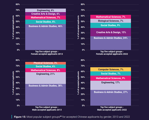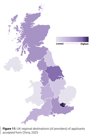 虽然中国学生近两年申请和录取人数出现小幅下滑,但不影响中国仍旧是英国最大的本科(UG)全球市场,2023年有33,195名中国学生申请英国的本科学习,占了国际学生中的四分之一,比来自威尔士或北爱尔兰的学生还多。