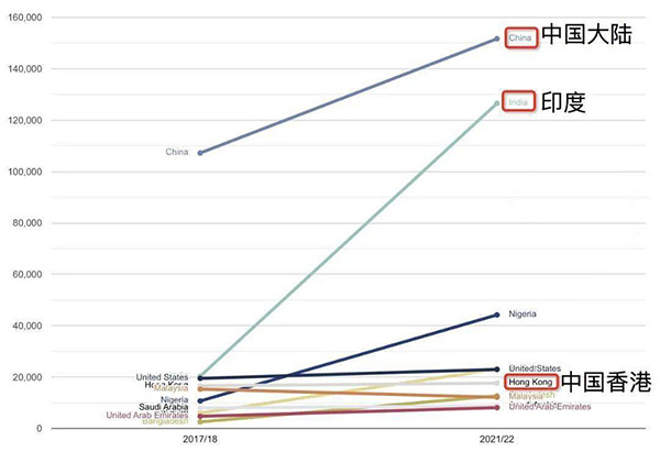 2021/22学年,英国大学留学生总人数上涨12%;非欧盟学生人数增加了24%。在非欧盟学生中,31%来自中国,共计173,575人。人数依然远超其他非欧盟国家/地区