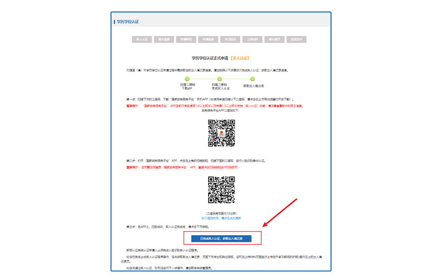 请您通过扫描网页提供的二维码,下载名为“国家政务服务平台”的手机APP,并按照提示进行人脸识别身份认证。