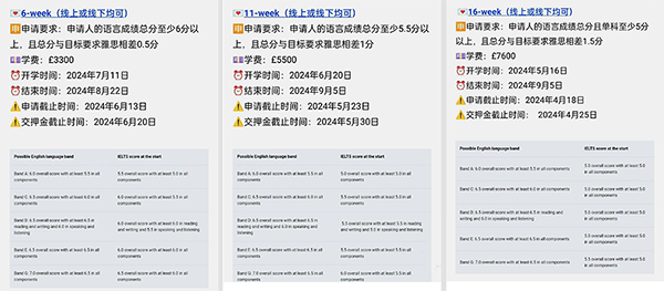 2024年南安普顿大学暑期语言班将继续提供全线下和全线上的两种学习模式,共分为:16周、11周和6周三个周期。各周期语言班申请要求、截止时间、学费等如图所示: