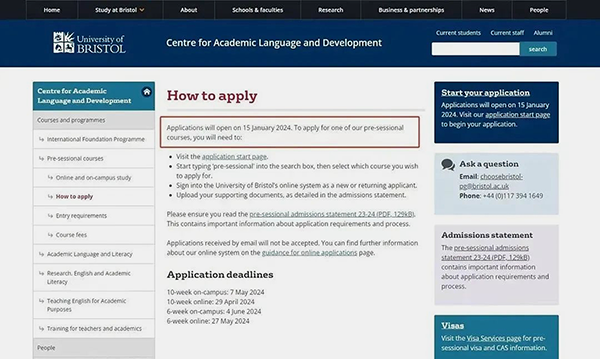 据官网最新信息,布里斯托大学2024年的语言班将于本月15号开放申请,同时官网也公布了详细的截止时间,具体信息如下图: