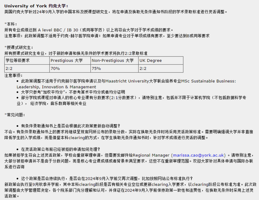 国约克大学录取标准调整
