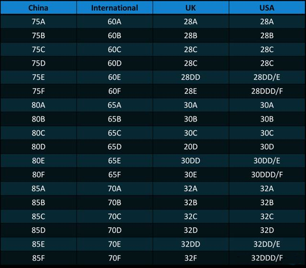 女性文胸尺码对照表