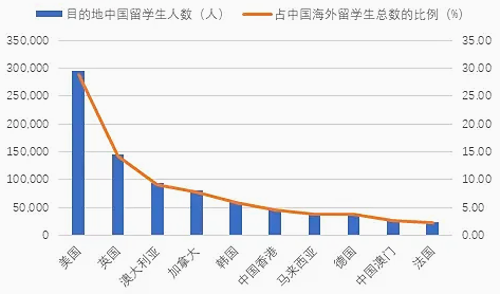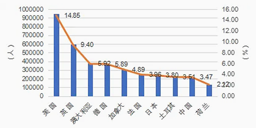 根据UNESCO数据显示,截止至2021年,最多中国学生选择的前五个留学目的地,占中国海外留学生总数的65.96%,这五个国家分别为: