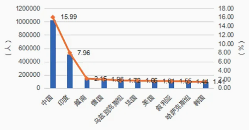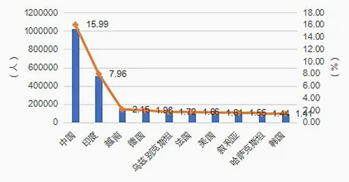 美国、中国、德国、法国不仅是前十大留学目的国,还是前十大留学来源国。其中,中国是国际生最大的来源国,全球15.99%的国际学生都来源于此