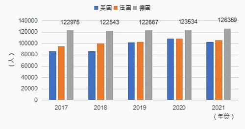 出于保持学术交流和文化交往等各种原因,发达国家学生出国留学也稳步发展。2017-2021年,德国在国外留学人数稳定在12万人以上,而美国和法国在国外留学人数均在10万人左右。