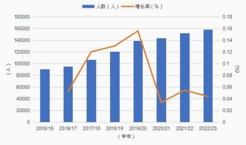 尽管受到全球大流行的影响,2020/21、2021/22、2022/23学年中国留学生在英国的总人数仍保持着稳定增长。具体来说,留学生人数分别为143,820人次、151,690人次、158,335人次,增长率分别为3.4%、5.5%、4.4%。