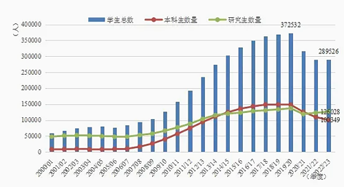 研究生学位、非学位课程以及OPT课程的注册人数在2020年短暂下降后,均开始有所回升,特别是研究生学位的学生人数已经恢复到了大流行前的水平。到2022/23学年,中国在美研究生的人数超过本科生25,679人。