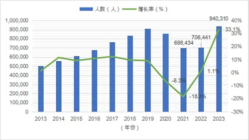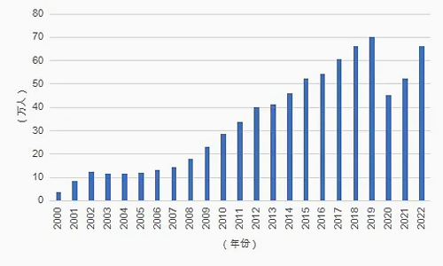 从2000年到2019年,尤其是在2008年北京奥运会后,中国的留学人数经历了快速增长,与中国参与全球化的趋势一致。尽管2022年的留学人数尚未恢复至2019年的水平,但从2023年美国、英国等国对中国学生签发的留学签证数量来看,中国留学生海外留学需求依然强劲,出国留学态势稳步恢复。