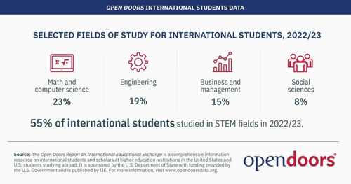 《2023年门户开放报告》(Open Doors 2023)显示,数学与计算机科学、工程学、工商管理、社会科学、物理与生命科学是中国学生赴美留学最热门的五个专业。