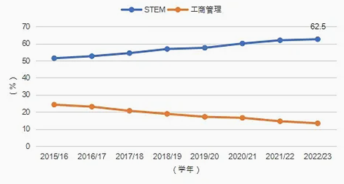 自2015/16学年以来,中国在美留学学生攻读STEM专业的学生比例持续增加,并于2020/21学年超过60%,2022/23学年达到62.5%,大幅高于国际学生在美留学选择STEM领域的总体水平(55%)。