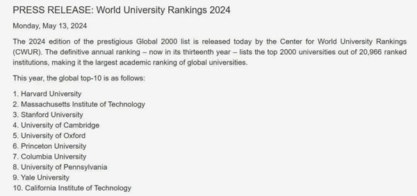 5月13日,世界大学排名中心(The Center for World University Rankings, CWUR)发布了最新的2024世界大学排名!